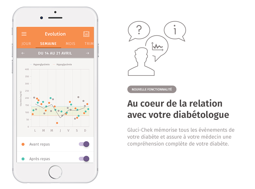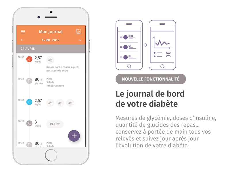 Intégration d’un journal d’autosurveillance glycémique avec possibilité d’enregistrer ses mesures de glycémie et ses doses d’insuline.